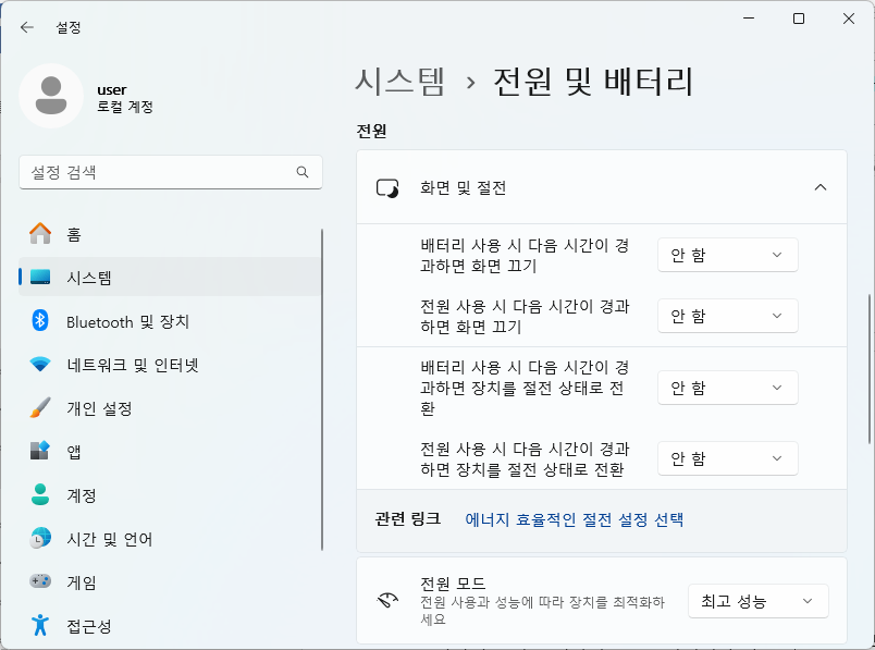 아래처럼 설정해야 하지만, 화면보호기 등도 함께 설정해야 하기 때문에, 권장하지는 않습니다.